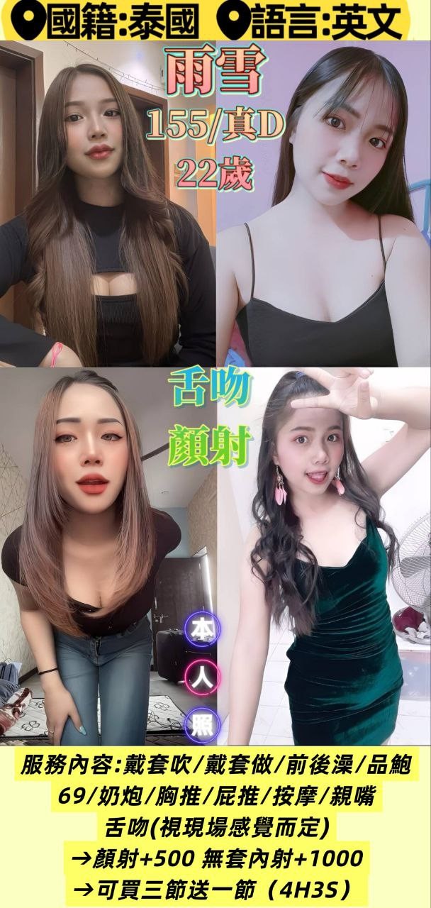 無套吹/戴套做/前後澡/舔蛋/奶炮/胸推/屁推/按摩/親嘴/舌吻(視現場感覺而定)