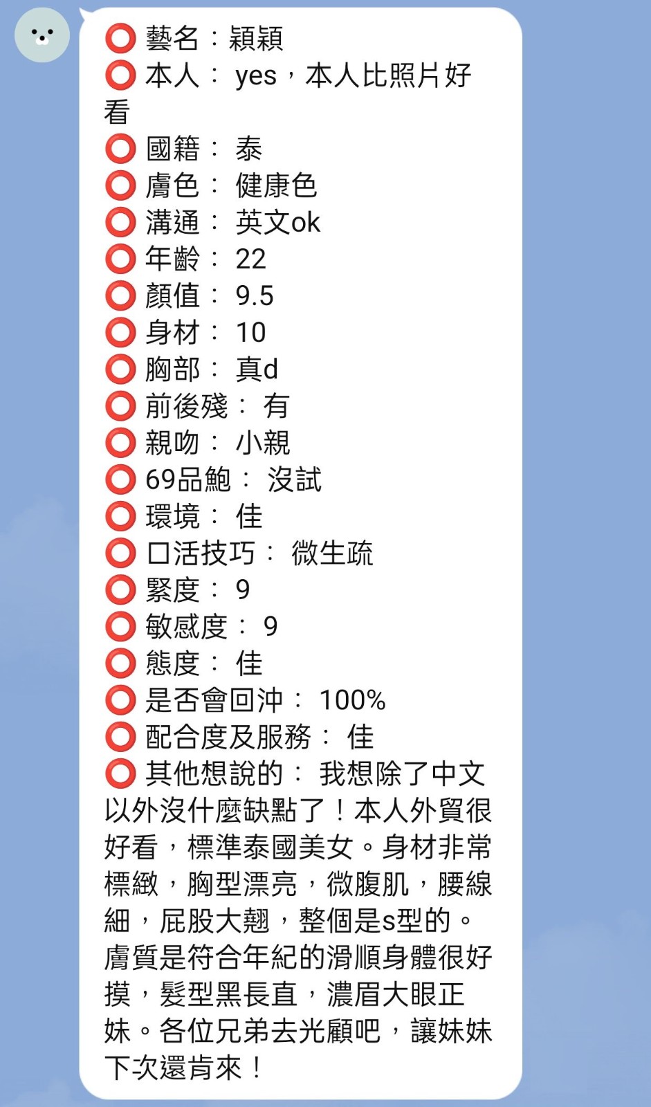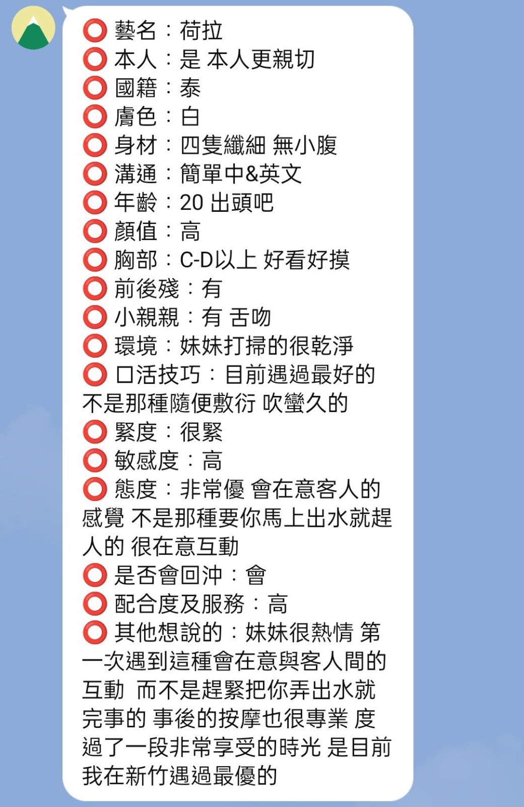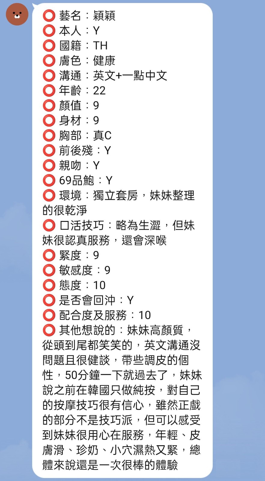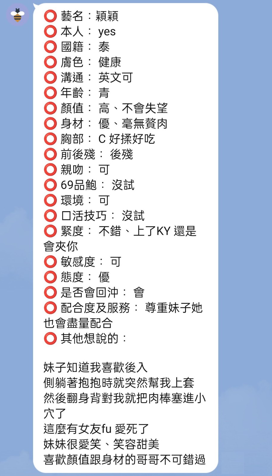 腰力很好 口技不錯 下面很敏感~   Review by 董**